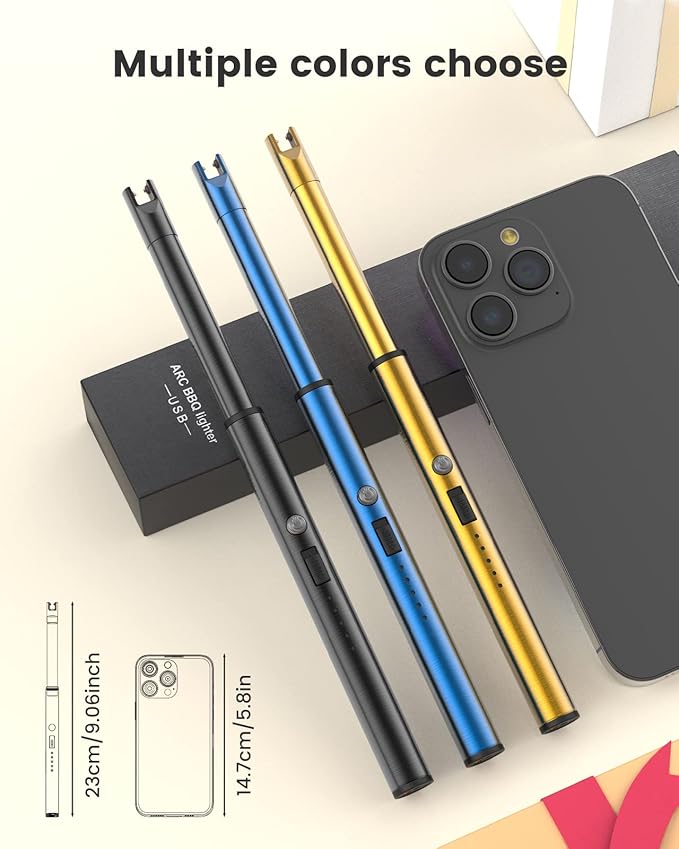 - 【Flame-less Windproof Portable Lighters】Electric candle lighter size is 9.06 x0.59 x0.59 inches, weight is 1.48 OZ. Easy to store and carry. The windproof and splash-proof design of the electric arc lighter ensures that you can easily use it under any weather conditions