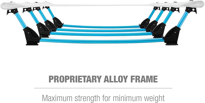 - Holds up to 265 pounds with proprietary aluminum alloy legs and frame; cot cover and zippered carrying case made from 600-weave rip-stop polyester