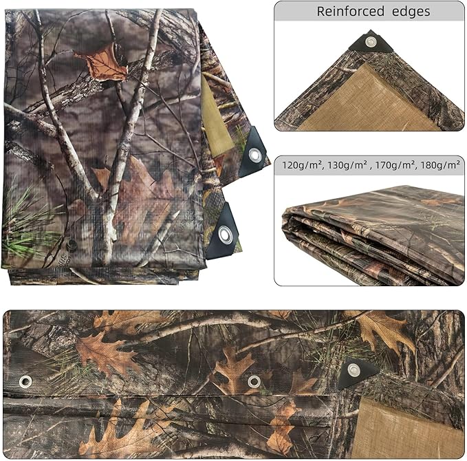 - High Qualtiy Fabric: Tongcamo tarp is made of high-density, tightly woven, made-to-last polyethylene fibers, UV protection against harmful sunrays and fading, waterproof, sunproof and windproof, can be applied to rain, shine, snow or wind all seasons. It has the strength, durability, woven tightly together and the plastic is laminated. The Tree Camo Tarpaulin has a 9 mil thickness, 3.5 oz. per square yard, and a 8 x 8 weave count.