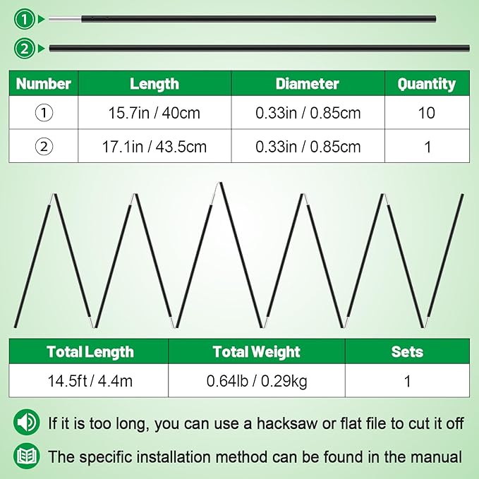 - Package Included: You will receive an 11-section tent pole replacement with a total length of 14.5 feet, an elastic rope, four male pole tips, four washers, and an instruction manual. With these replaceable tent pole repair kits, you can easily replace broken poles for tents.