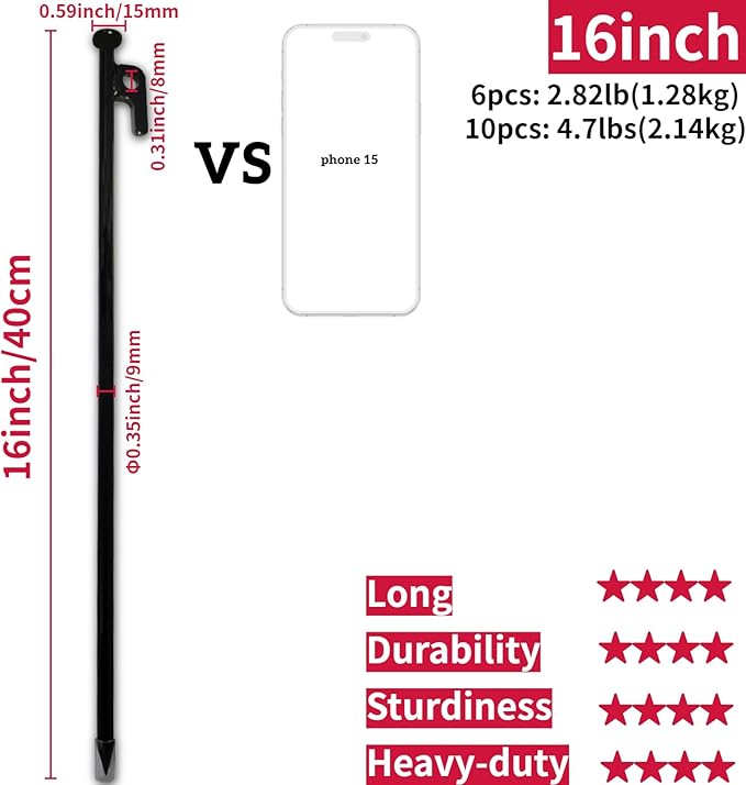 - WINDPROOF: 16inch long. Used the heavy duty stakes in 40+ 𝐦𝐩𝐡 winds and tent will never moved. Long enough to provide a good anchor point. Better performerce for extreme weather than plastic nails.