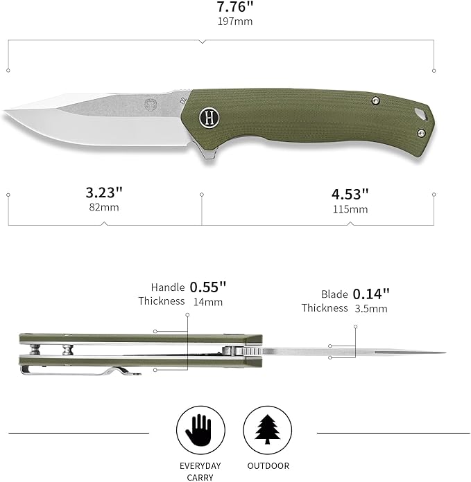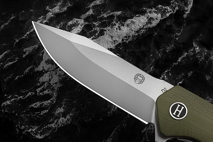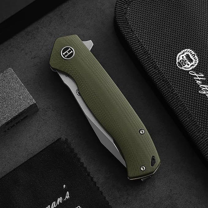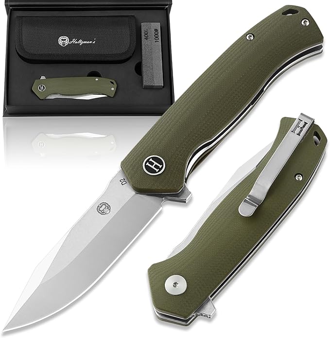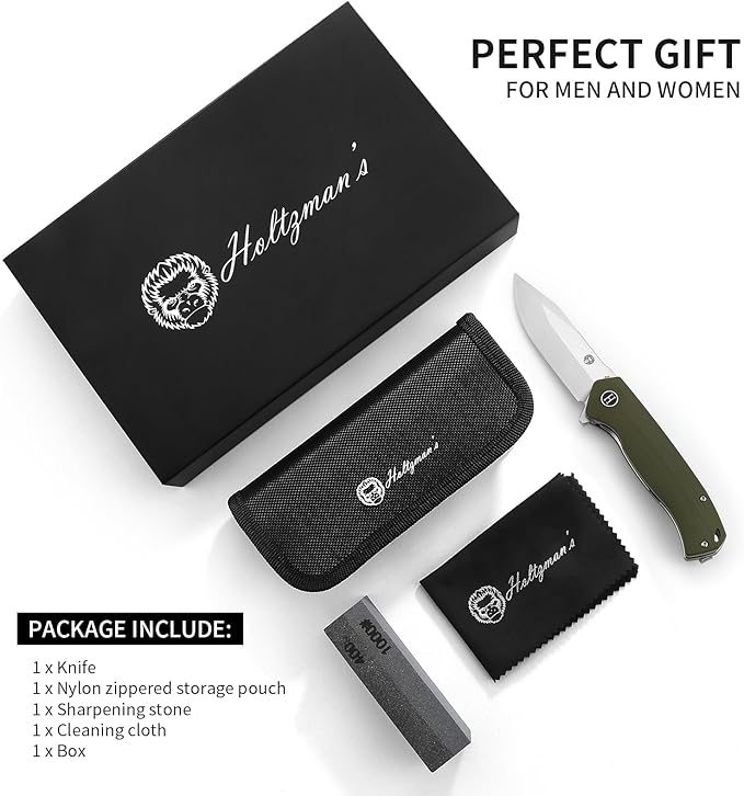 Holtzman's Gorilla Survival Folding Knife D2 Steel Blade G10 Handle Pocket Knife EDC Giftset for Men and Women (half stonewashed half silver blade + green handle (LM042))