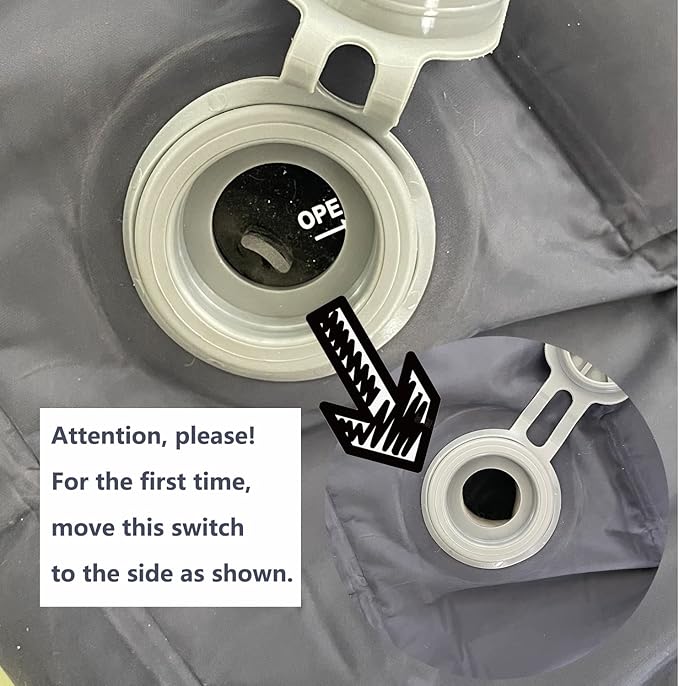 - TIP FOR USING: When opening the inflation port for the first time, move the cover with the word "open" aside.