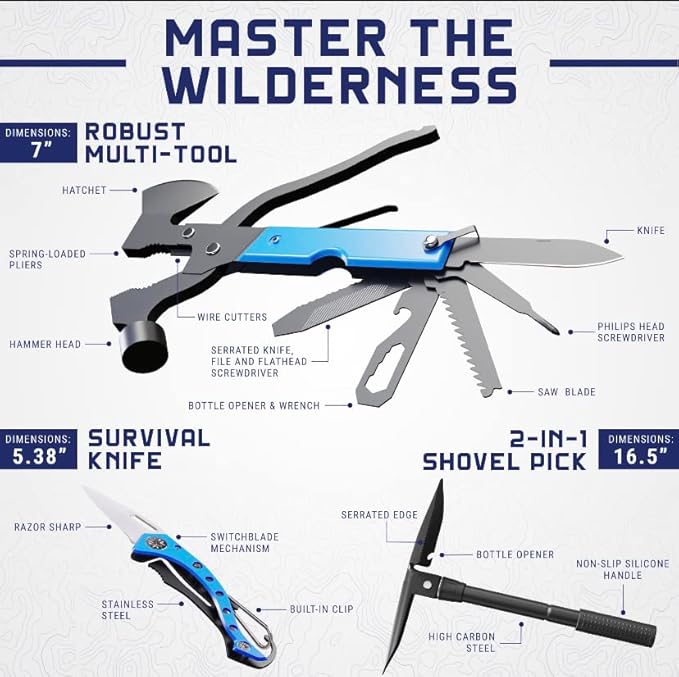- THE PERFECT GIFT for adventurers or any outdoor enthusiasts. Our all-in-one survival gear kit, first aid kits, and more ensure safety and preparedness for any outdoor escapades. For ultimate preparedness, click 'ADD TO CART'!