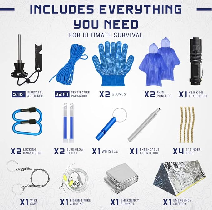 - SPOT YOUR SURVIVAL TOOLS IN SECONDS with the striking all-blue color of our disaster preparedness kit. This outdoor survival kit is the ultimate solution to quickly locate your gear, so you can handle any emergency with ease