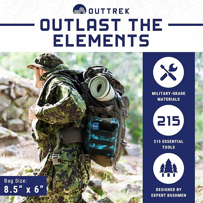 - THE COMPLETE SURVIVAL KITS with Outtrek's 215 Pcs Survival Pack. Including a first aid kit for camping, an emergency kit for disaster preparedness, a multitool, a Shovel/Pick Combo for digging and picking, and more