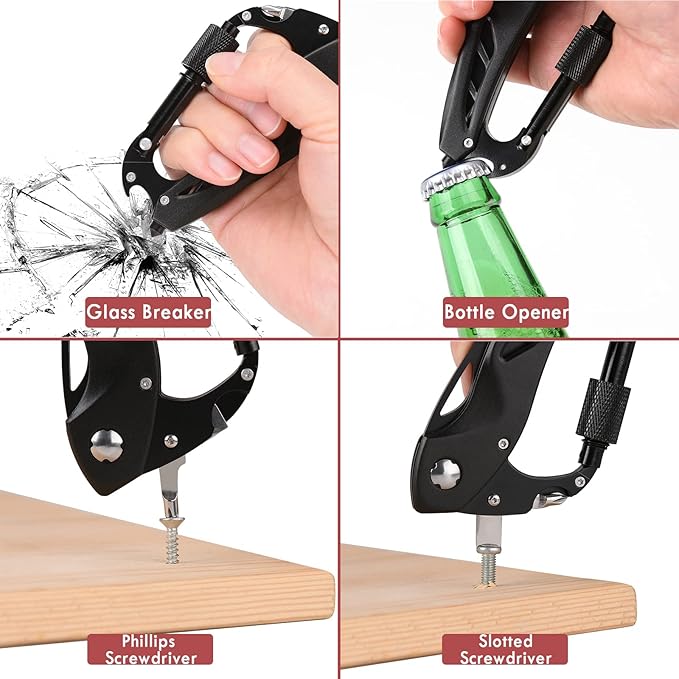 - πππ©ππ₯π¦π ππ¨π‘ππ§ππ’π‘π¦:This survival multitool includes a folding pocket knife,a bottle opener, a glass breaker for emergency, a phillips screwdriver, a slot screwdriver, a carabiner keychain clip.A great survival gear for men outdoor camping hiking.