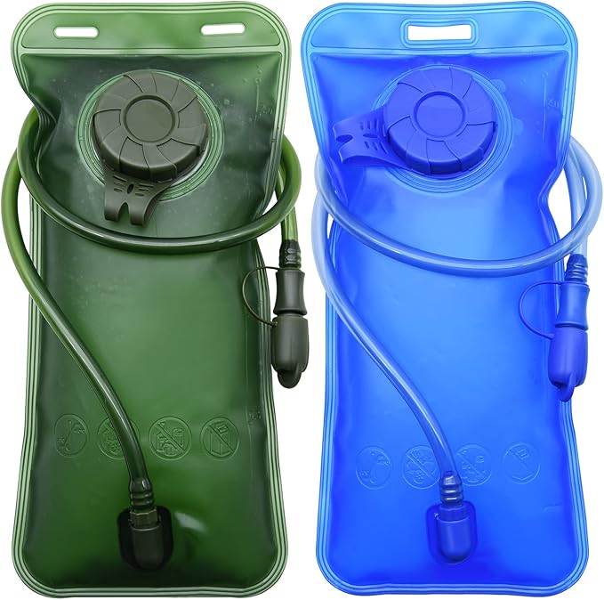 - 【Maintain Fresh Hydrated】- You will get 1pcs blue hydration bladder, 1pcs army green hydration bladder and 2pcs suction pipe. 2L water bladder can contain water at -4°F to 122°F. Pipes (0.03in diameter, 31.5in length) provide a wholesome flow for easy drinking and keep you hydrated when hiking, climbing or running, etc.