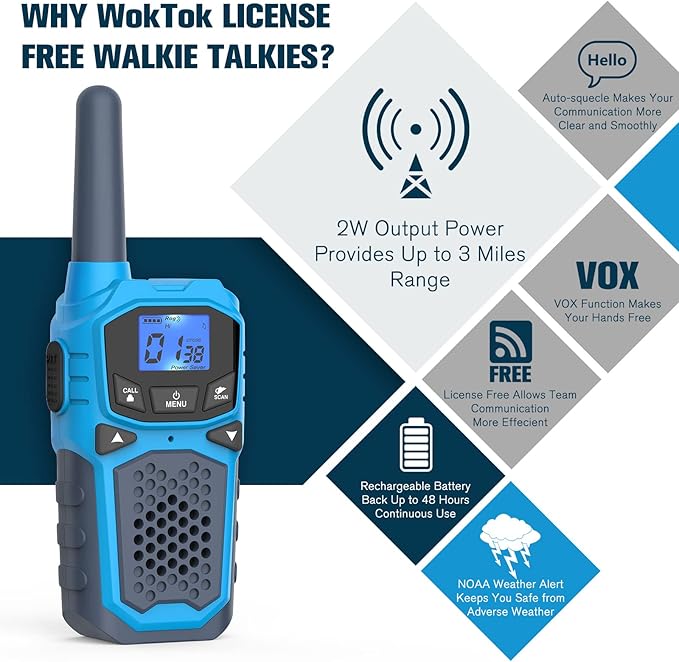 5 Walkie Talkies for Adults Long Range-WokTok Rechargeable Portable 2 Way Radios,Hiking Accessories Camping Gear Toys for Kids,with SOS Siren,NOAA Weather Alert,VOX,Easy to Use Camping Hiking