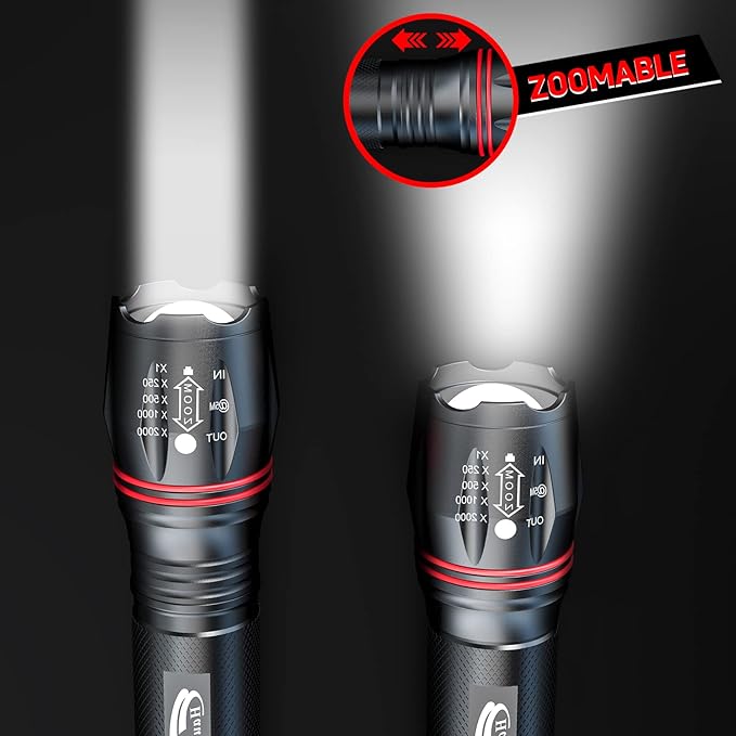 - Five Modes & Zoomable Focus: This led flashlights high lumens with five adjustable modes high/medium/low/strobe/SOS mode. The flashlight's adjustable focus allows you to zoom in for intense spotlighting or zoom out for a wider beam that can cover a larger area