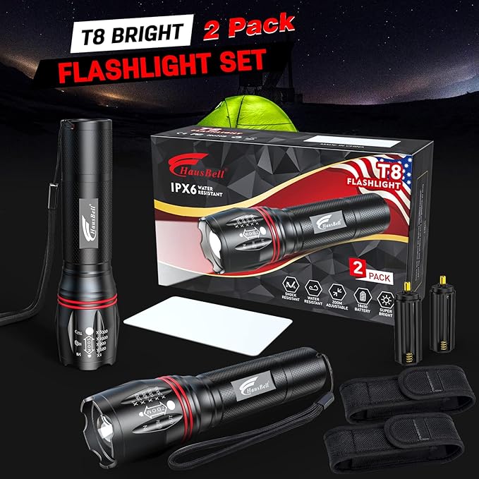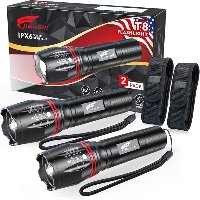 HAUSBELL T8 Upgraded LED Flashlight Bright, Zoomable Tactical LED Flashlights Flash Light with High Lumens and Five Modes and Camping Accessories, 4 Pack