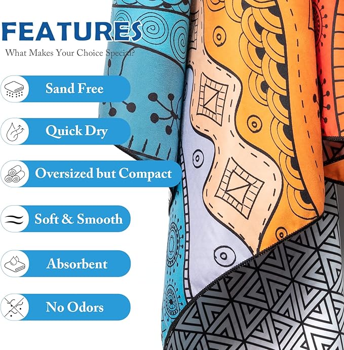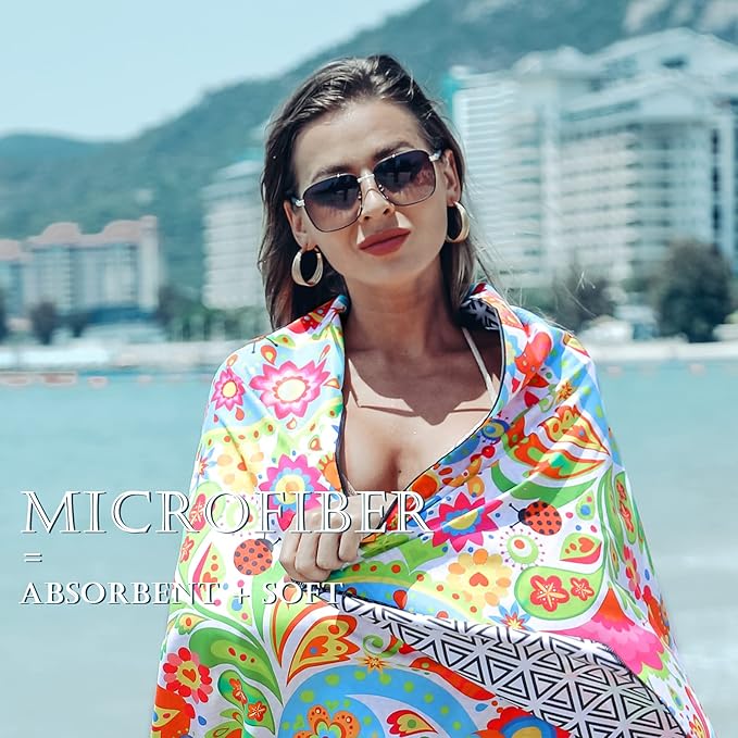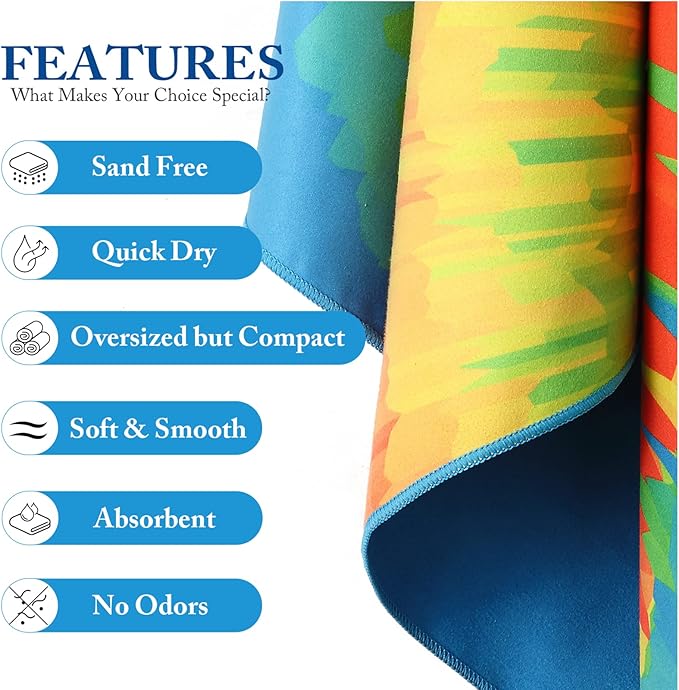 - 🔵 QUICK-DRYING & SUPER ABSORBENT - Our quick dry beach towel which dries three times faster than a standard cotton towel and will stay free of unpleasant damp smells. In addition, our towels are super absorbent. The fibers will soak up all water and moisture off of you in no time, leaving you dry and ready to go.