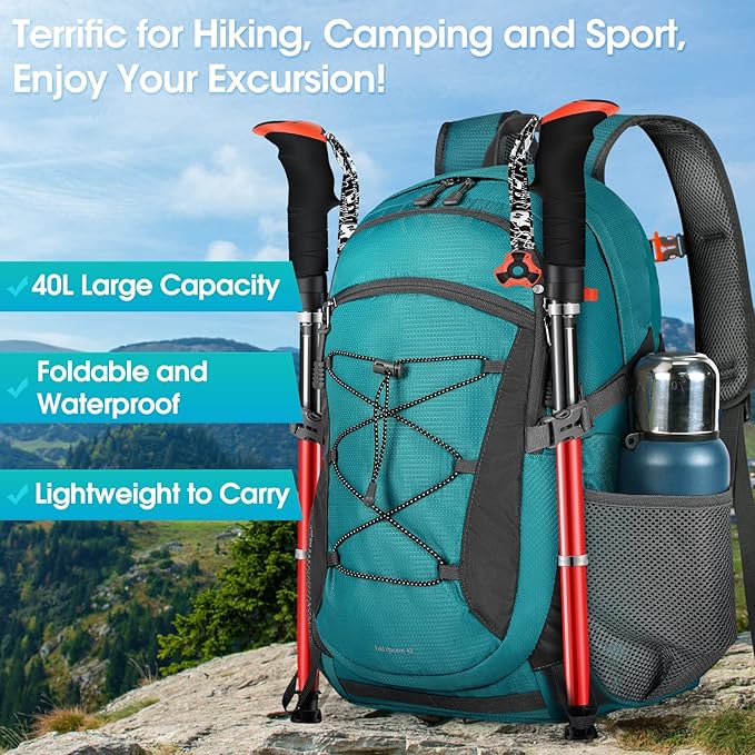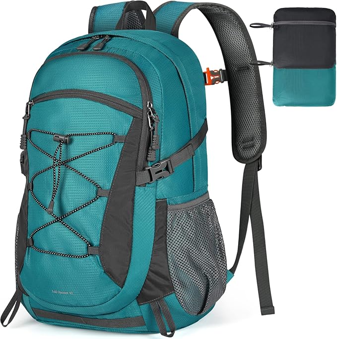 • Compact and Comfortable: This hiking backpack can hold at most 40 litres of items, and its weight is only 1 pound. It can be folded and stored in a small pocket, you can unfold and enlarge it when in use. Surrounded by lots of mesh-like breathable sponges, this foldable backpack won't cause any fatigue while travelling. Besides, the adjustable chest belt could help you balance the load and keep it stable.