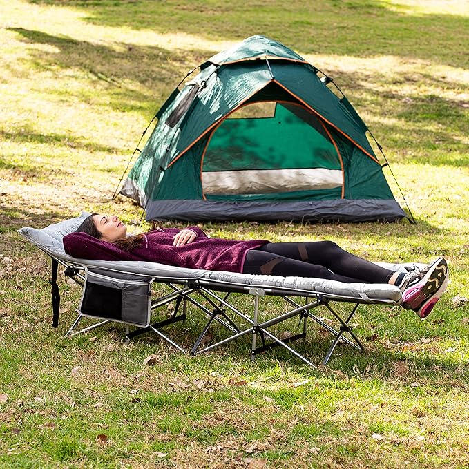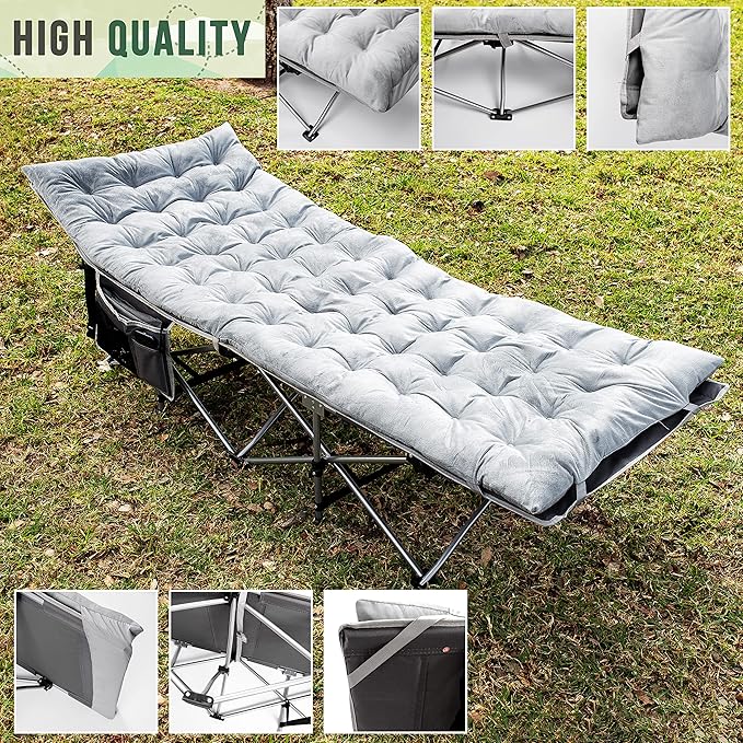 Zento Camping Cot and Mattress Folding Outdoor Travel Bed - Heavy Duty Max Load 450 LBS Premium Quality Cot Bed with Pad for Comfort Sleeping for Travel Home and Anytime Use