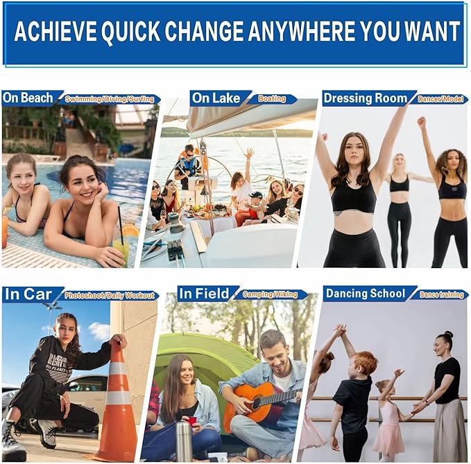 - [ Upgraded & Secret Design ] - The portable changing room is made of high quality fabrics, soft and durable material ensures optimal comfort for you. Light proof and thickened design allows you to change discreetly in public. Even cover it on wet skin, it will not stick on your body to reveal secret identity to surrounding people. Every package comes with a compact storage bag for easy carrying.