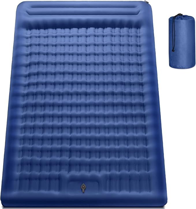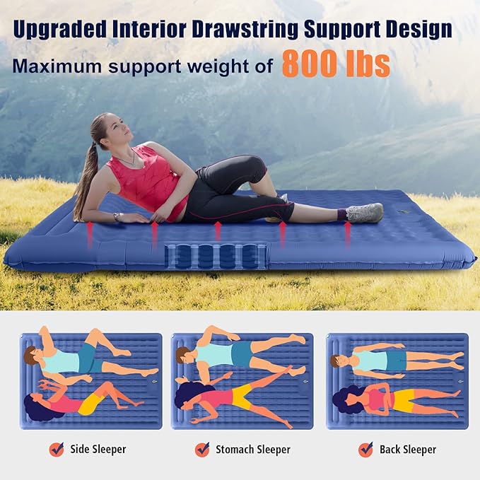 - 【COMFORTABLE CAMPING MATTRESS】: The camping air mattress 2 person adopts a special drawstring design with 200 support points to evenly distribute pressure and increase the weight of the camping sleeping pad to 800 pounds to ensure body balance and ensure comfortable sleep for back, side, and stomach sleepers.