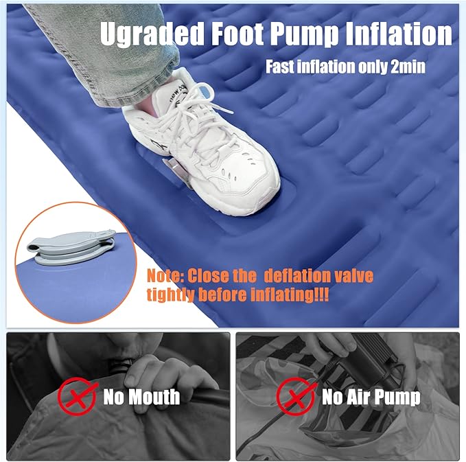 - 【EASY TO INFLATE AND DEFLATE QUICKLY】: Built-in foot pump, just step on it for 1 minute to fully inflate, support Mini Air Pump inflation. The inflation valve and deflation valve are independent, and the double-layer valve effectively prevents the camping mattress pad from leaking and realizes rapid deflation.