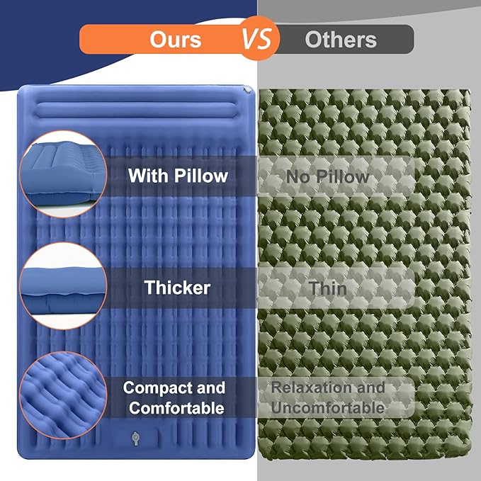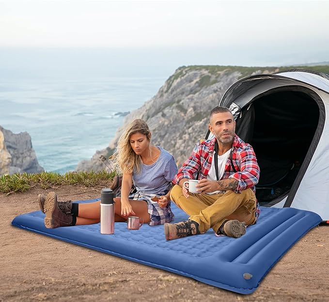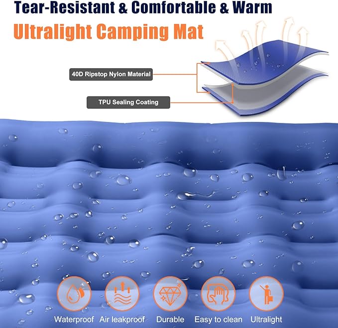 - 【DURABLE & WATERPROOF】: Our double sleeping mat is made of outdoor-grade material 40D nylon and TPU seal coating, durable, abrasion-resistant, tear-resistant, moisture-proof, cold-proof, suitable for all kinds of weather, conditions and terrains. This will ensure you get a good night's sleep even when you're outdoors. When you turn over on the sleeping pad for camping, the sound produced is minimal, it's as comfortable as sleeping in your home bed.