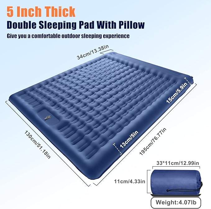 - 【5 INCH SLEEPING PAD FOR CAMPING】: Thicker double inflatable sleeping pad for improved comfort,with an inflated size of 76.77 inches * 27.55 inches *5 inches, the 5-inch double camping sleeping pad has drawstring design inside to keep you away from the hard ground. The built-in pillow is designed to relieve pressure on the back and neck.