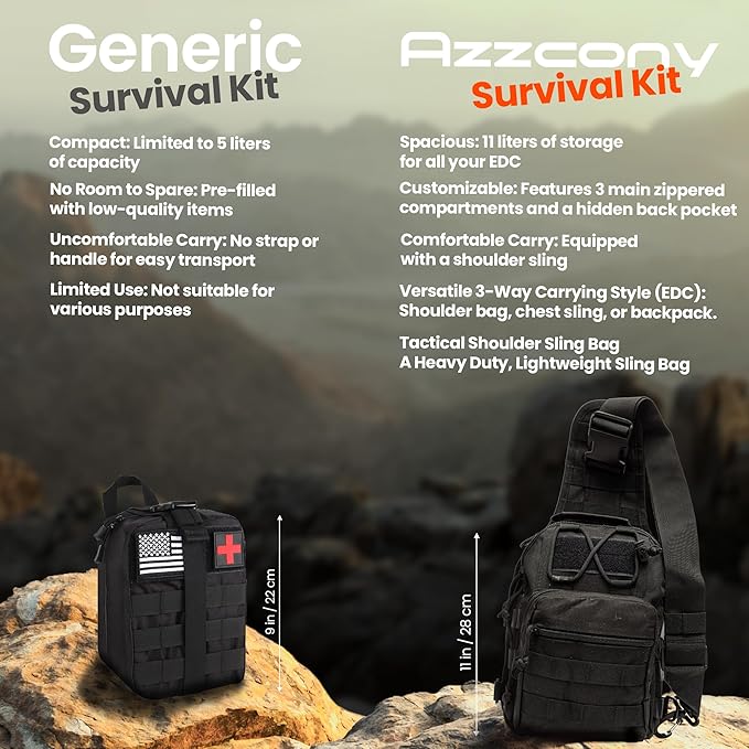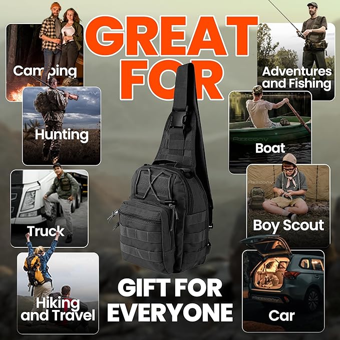 - Emergency Survival Backpacks Kit: The Durable Tactical Sling Bag is constructed from strong polyester material that is both water and scratch resistant. The heavy-duty zippers are reinforced with double stitching, ensuring they can withstand prolonged use and provide long-lasting durability.