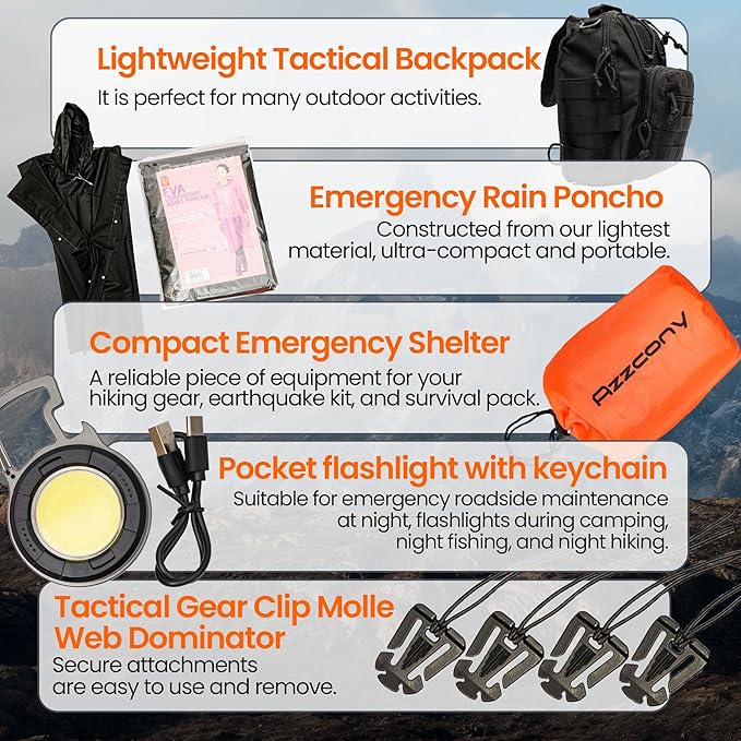 - Top Practical Survival Tools: All survival gear in this kit are essential, including a Multifunction Shovel, 12 in 1 Saber Card, 4 in 1 Survival Bracelet, Combat Tourniquet, 1 Set of Fishing Kit, Fire Starter, Modern Compass, Flashlight, Flashlights, Raincoat, Emergency Tent Shelter, First Aid Kit, Professional Wire Saw, Tactical Pen, 2 in 1 Fork & Spoon, 4 Web Dominators, 4 Climbing Hooks and more, which can meet your different needs.
