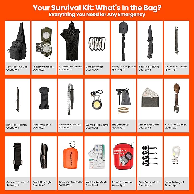 - Included Components : 1x Backpack, 1x Multifunction Shovel, 1x 12 in 1 Saber Card,1x 4 in 1 Survival Bracelet, 1x Combat Tourniquet, 1x Set of Fishing Kit, 1x Fire Starter, 1x Modern Compass, 1x Flashlight,1x COB Flashlights, 1x Raincoat, 1x Emergency Tent Shelter, 1x Professional Wire Saw, 1x Tactical Pen, 1x 2 in 1 Fork & Spoon, 4x Web Dominators, 4x Climbing Hooks, 4x Fire Ropes, 1x Knots Poket Guide, 1x First Aid Kit (85 items) 1x Backpack, 1x Multifunction Shovel, 1x 12 in 1 Saber Card,1x 4 in 1 Survival Bracelet, 1x Combat Tourniquet, 1x Set of Fishing Kit, 1… See more