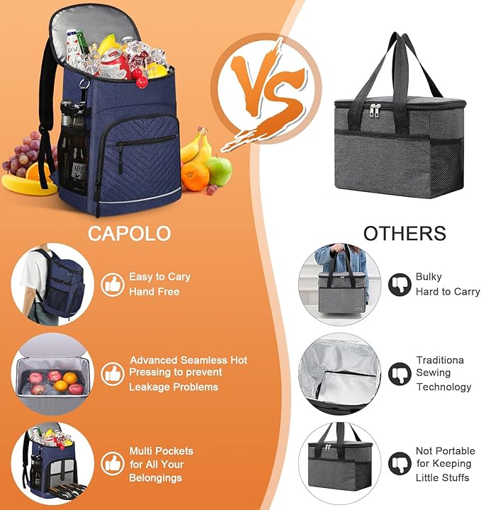 - 【20 Hours Insulated】Insulated thickened foam and leak proof liner ensure excellent insulation performance. Capolo backpack with cooler compartment will keep your drinks and food hot/fresh/cool for up to 20 hours. Absolutely perfect for camping, beach, picnics, hiking, travel, boating, outdoor games and work.