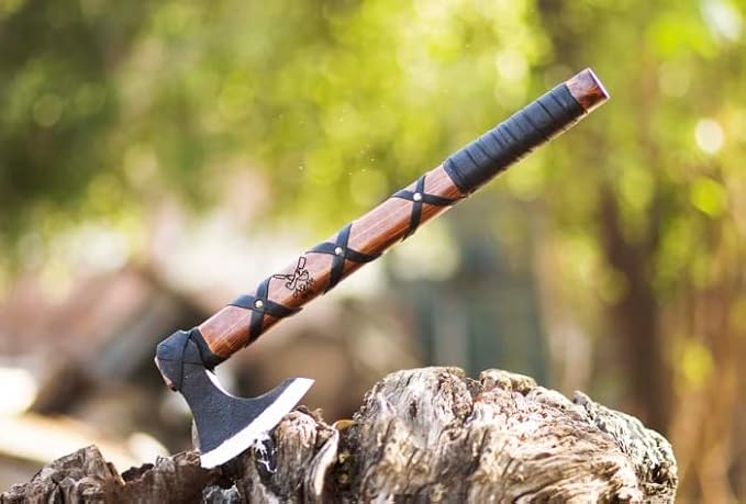 - ✅ It is fully usable tool. Handmade Carbon Steel Viking Axe / Hatchet with Rose Wood Shaft, Beautiful Designed Viking Camping Axe.