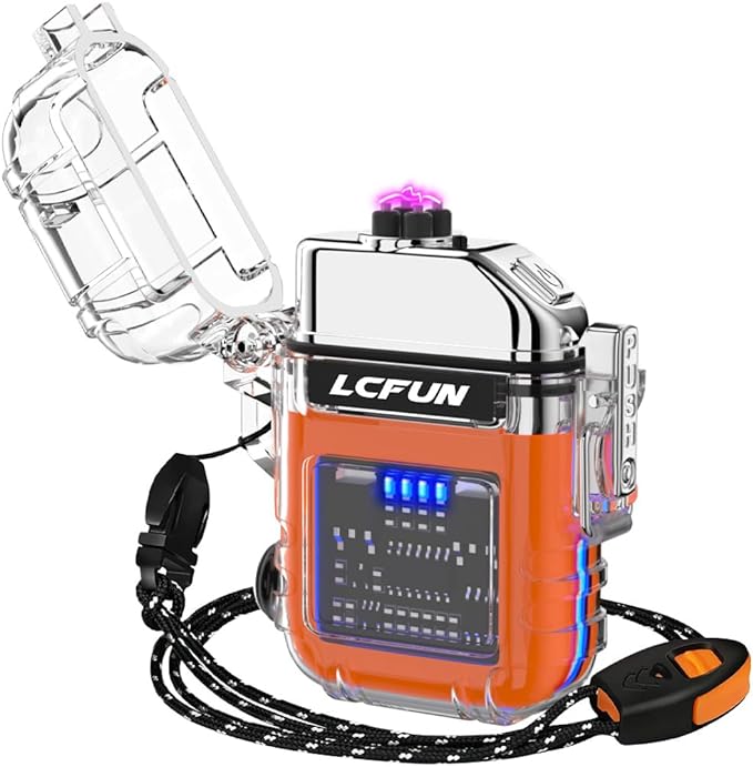 - ✨Battery Notification & Cool Strip Light▶ Upgraded LcFun survival lighter can display battery power in real time. The indicator light will flash when charging, when 4 LED lights all turn on, it is fully charged. The side of the lighter has a led strip light, and the three color transformations.