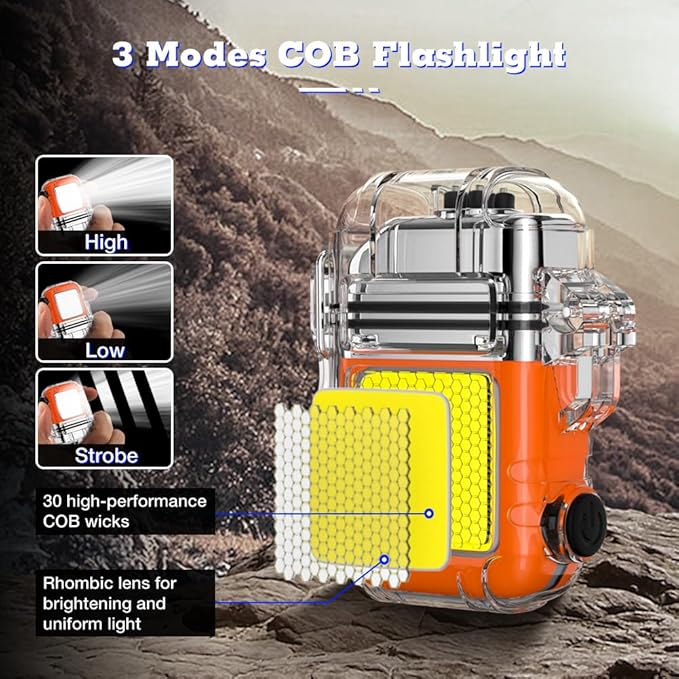 - ✨3 Modes COB Flashlight▶ High light, low light and strobe mode. Close the lighter's lid and press the side button to turn on/off the flashlight.