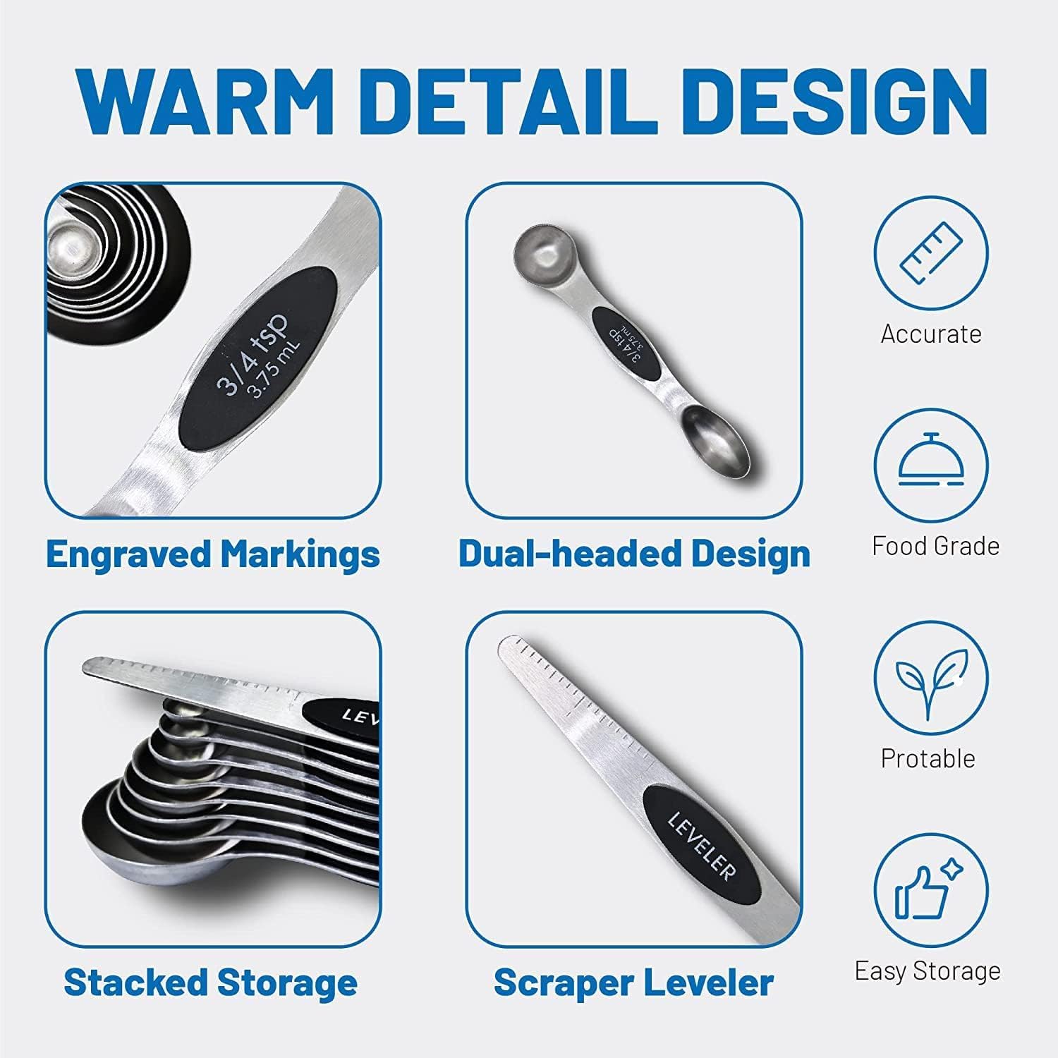 - 【Convenient Storage】Unique stackable design makes cups nest together easier, and each piece of stainless steel measuring teaspoon has an enhanced magnetic center for easy stacking together, to save kitchen space and reduce clutter, making your kitchen look neat and elegant.