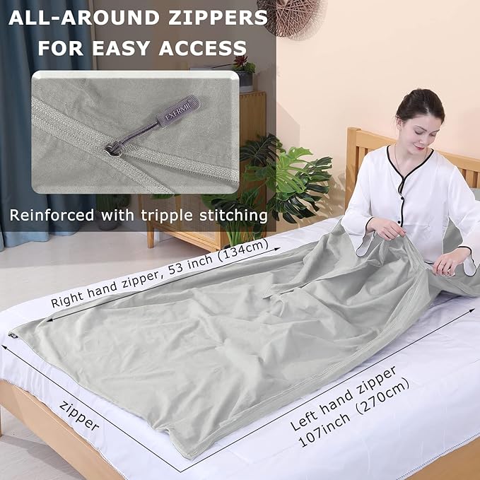 - This XL sleeping sheet provide you with comfort when traveling. It’s wide (87x43 inches) and allows you to turn inside it without being twisted. Full-length zippers run along left, right side and also the bottom of the sheet, which enables you to get in and out of easily from any side of your bed, stretch your feet out of the bag for comfort. This multifunctional sleep sack also turns into one giant cotton bed sheet (87X88 inches) when fully unzipped. The pocket keeps your pillow in place.