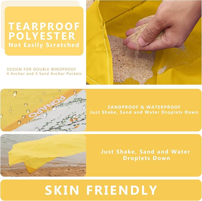 - 🌴【WATERPROOF & SANDPROOF & SCRATCHPROOF】: The beach blanket can't be punctured thanks to the high-quality, lightweight polyester material. Just shake the beach mat to have the sand and water droplets slide off with ease. For your upcoming trip, the beach mat may be conveniently machine cleaned and dried.