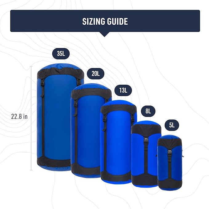 - Durable 35-liter compression stuff sack squishes down bulky items to one-third the original volume to maximize packing space in a backpack, suitcase, or duffle