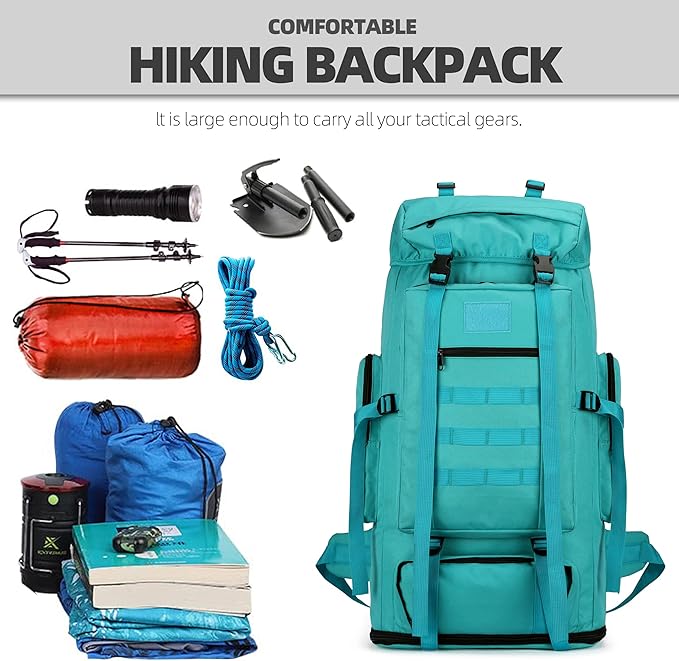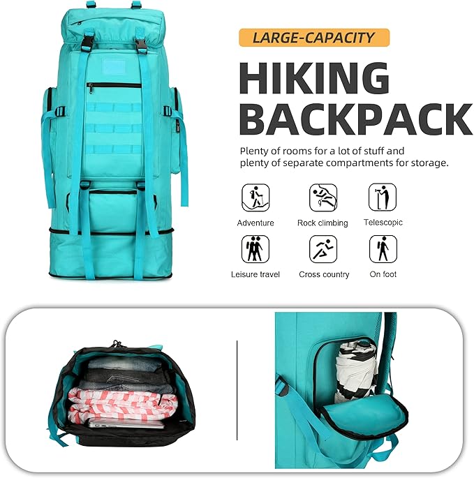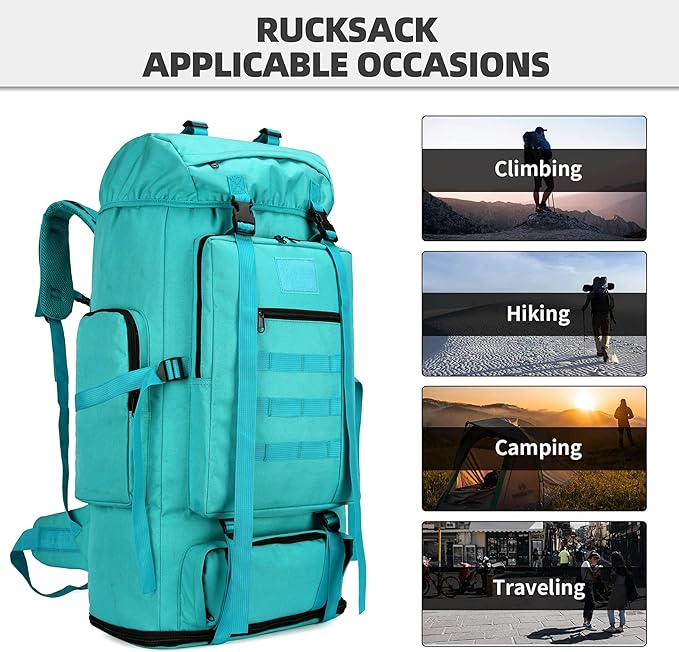 - 【Large Capacity Loading】: 100L large capacity camping mountaineering backpack main bag can hold clothes, quilts, tents, sleeping bags and travel items, and can accommodate 2-3 people travel gear. The molle system can be used to bundle and carry items such as moisture pads, trekking poles, sleeping pads, picnic mats, camera stands and more.