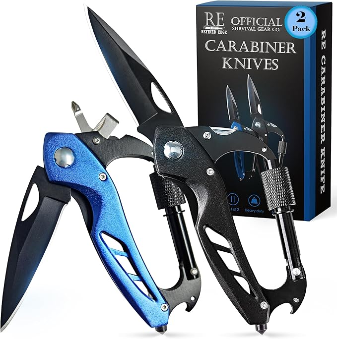 - Two-in-One Value: Each purchase includes a pair of carabiner knife multitools - one in sleek blue and another in stylish black. Be well-prepared for outdoor adventures with this indispensable tool.