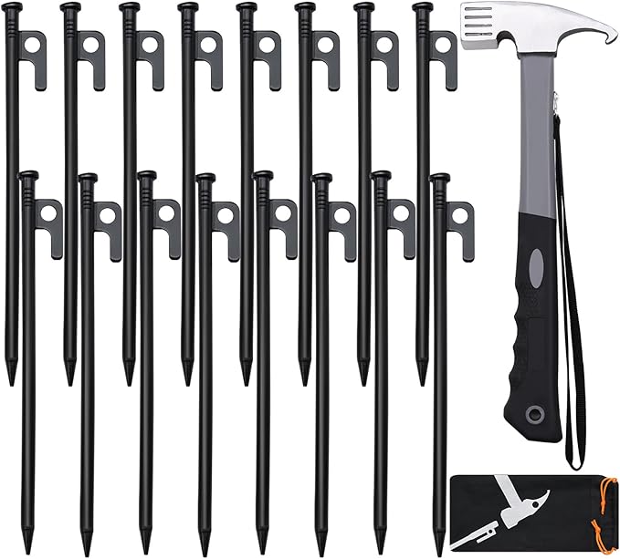 16pcs Tent Stakes and Hammer Set, 12in Heavy Duty Forged Steel Tent Stakes + Camping Hammer + Storage Pouch, Available in Rocky Place (16pcs 12in Stake+Hammer)