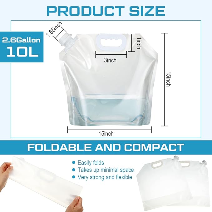 - Water Storage Containers: you will get 30 pieces of about 2.6 gallons (10 liters) collapsible water container bag, foldable and easy to store, not taking up storage space, you can put water storage in your backpacks during outdoor activities and traveling; Emergency water travel bags are able to store a large amount of water for you when hiking, camping, backpacking, climbing, cycling, fishing and more