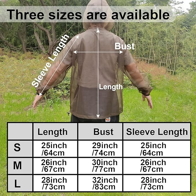 • The mosquito jackets are available in 3 sizes, S: 64x74x64cm/25x29x25in (length x bust x sleeve length); M: 67x77x67cm/26x30x26in (length x bust x sleeve length); L: 73x83x73cm/28x32x28in (length x bust x sleeve length)