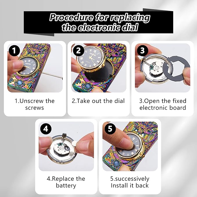 - 🐲 Luxury Design▶ Cool lighter exterior carved with exquisite relief, the body with dazzling clock, the bottom inlaid with blue cat's eye stone, candle lighter noble and luxurious appearance more eye-catching, the bottom with LED lighting.