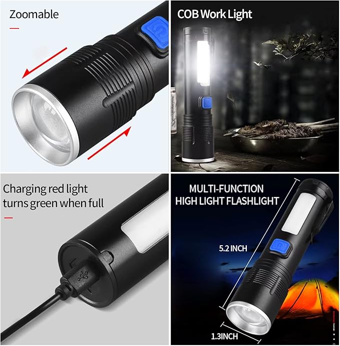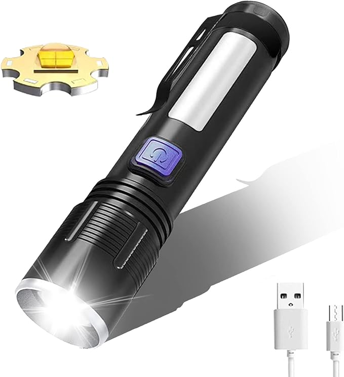 - USB Rechargeable LED Flashlight: high lumens has a built-in X H P50 upgraded chip, its brightness can easily illuminate the entire room and courtyard.