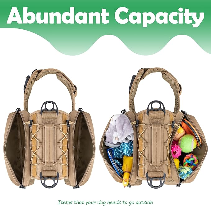 - 【Spacious Capacity】This dog backpack has a large and a small backpack on either side provides plenty of space for all your pet's essentials, including food, water, snacks, waste disposal bags and more. The large capacity allows you to take everything your dog needs for the day with you