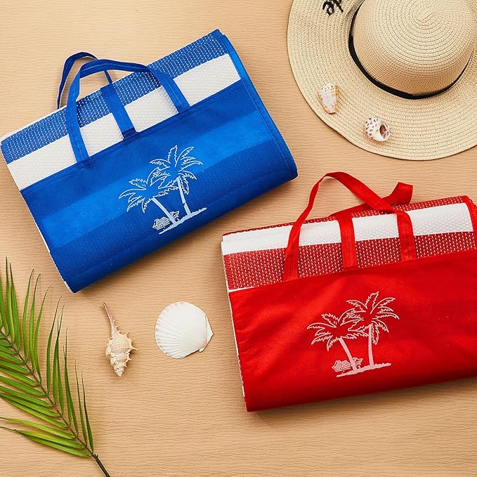 Woanger 2 Pieces Tatami Straw Ground Mat Foldable Waterproof Handy Mat with Strap Portable Straw Beach Mat RV Outings Camping Outdoor Travel Hiking Lawn, 60'' L x 78'' W, Red and Blue