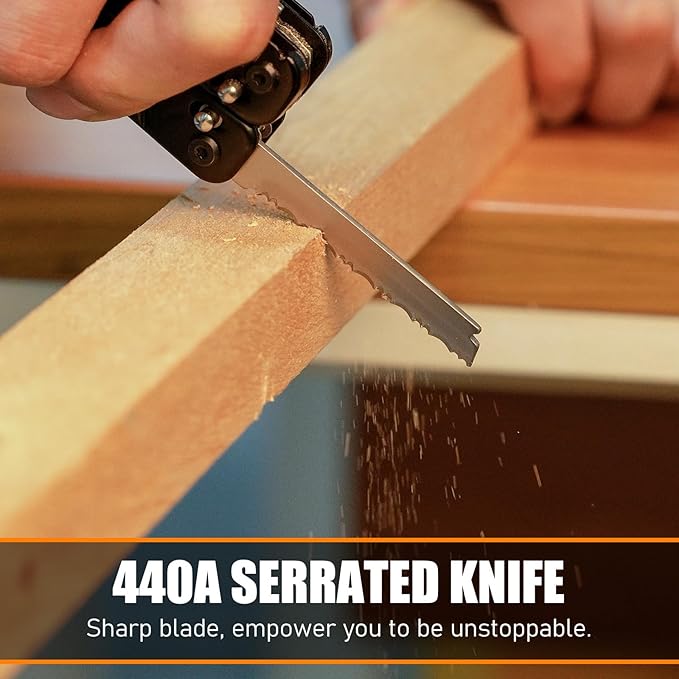 - 【CUT WITH TRUST】This multitool knife features high-alloy 440A steel giving an exceptional blend of hardness and durability to the edge, allowing for a precise and sharp edge. The steel has a hardness of 54 +/- 2 HRC and is highly rust-resistant. All the blades and tools lock in a way that ensures security to prevent closed unintentionally when you are using.