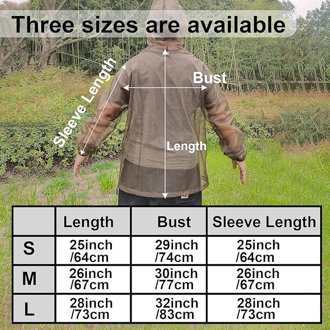 - The mosquito jackets are available in 3 sizes, S: 64x74x64cm/25x29x25in (length x bust x sleeve length); M: 67x77x67cm/26x30x26in (length x bust x sleeve length); L: 73x83x73cm/28x32x28in (length x bust x sleeve length)