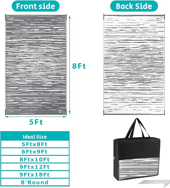- Versatile Outdoor Carpet: The indoor outdoor plastic rugs have multiple choice in different colors(4'x6',5'x8',6'x9',8'x10',9'x12',9'x18',8'round), is ideal for a variety of indoor outdoor activities,like patio mat, deck rug, garden rug, beach mat, picnic mat, BBQ party mat, rv camping rug,pool rug,outdoor doormat,garage rug,front door mat,allowing you to have plenty of imaginable space for more fun.