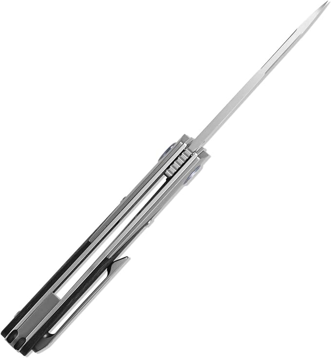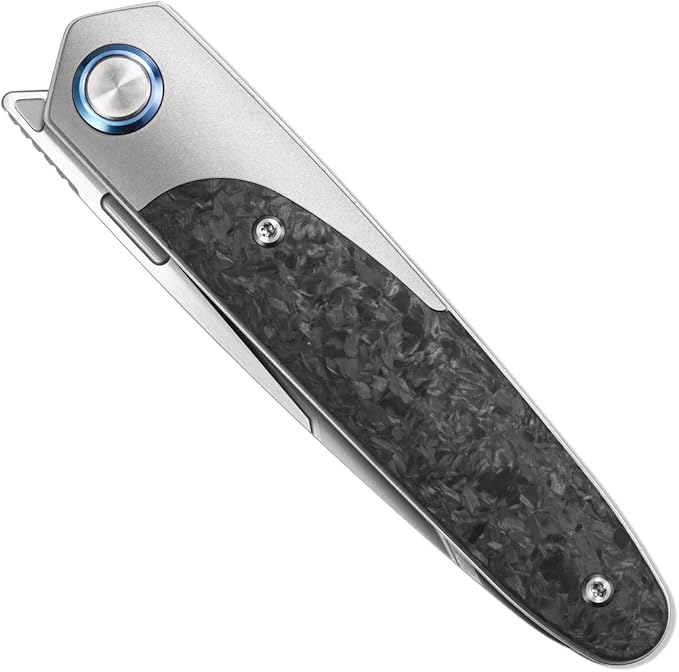 - · · Amazing EDC Tool knife with Titanium & Carbon Fiber Handle ,which is ergonomic, with the advantages of moisture-proof, oil-resistant and antiskid, offers anti-rust property and comfortable grip,weight-relieving pockets on inside front scale to carry comfortably light; lock bar stabilizer ensures lock won't over-extend when closing.