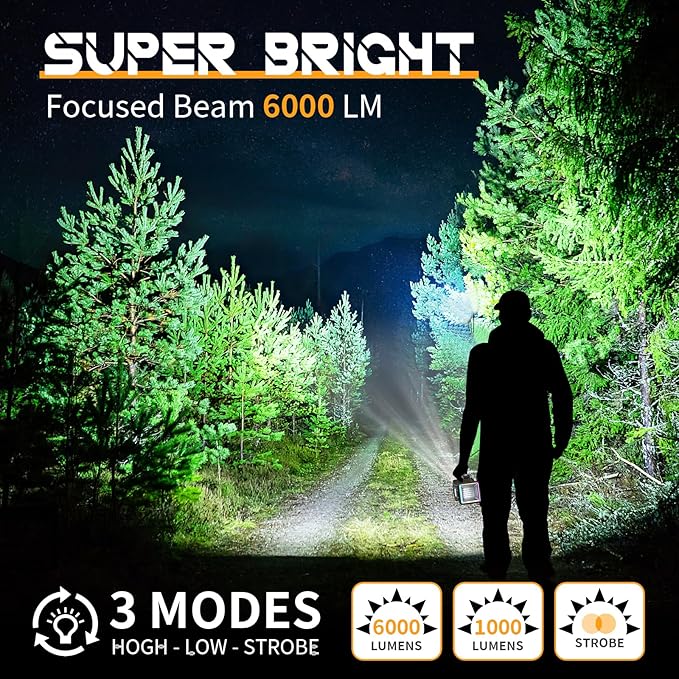 - 🏆【Super Bright Flashlight】9 Light Modes: front light (High -Meidum- Strobe), Rear lights(Strong uv light-Meidum uv light-red warning light), side light (High-Meidum-Low reading light), this spotlight provides an intense beam of light up to 6000 lumens, with a maximum illumination distance of 5000ft.Protecting you from worries in the dark.