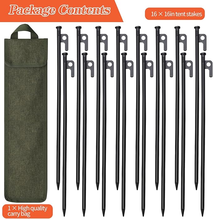 - 【Package Includes】- Stakes set includes 16 pack forged steel tent pegs (16in long/7oz each) and carry bag. Tent stakes are available in rocky place desert snowfield and grassland.