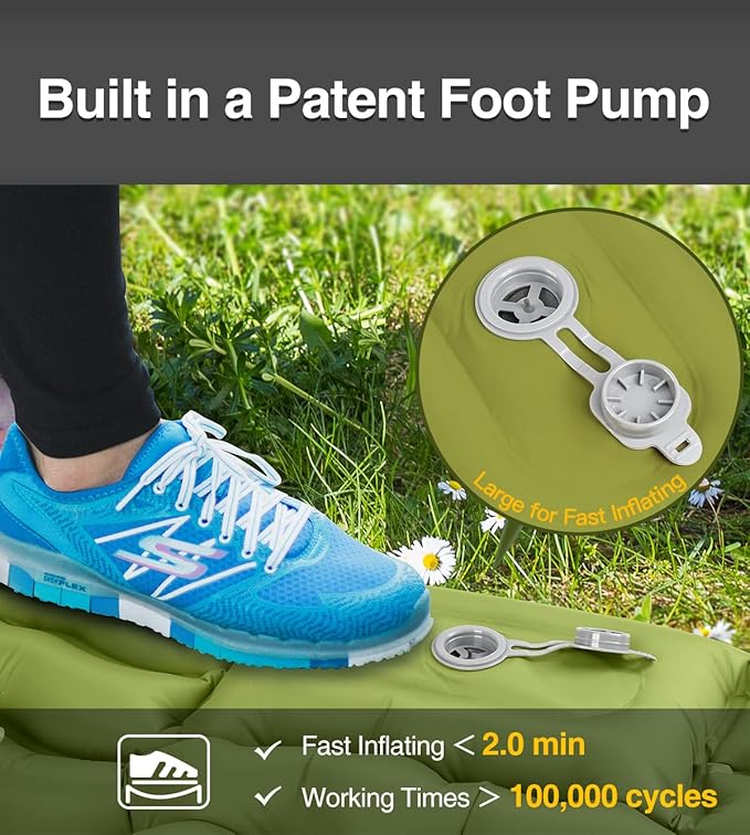 - 【Foot Pump for Easy Inflate】Builts in a power foot pump, this self-inflating camping pad is easy to inflate. Tips: It should be noted that before you start inflating, please check that the two deflation valves behind the pillows are closed.